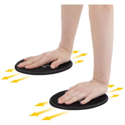 Dyski poślizgowe do treningu składają się z dwóch płyt wykonanych z wytrzymałego tworzywa. Jedna strona gładko sunie po podłożu, a druga zapewnia wysoki poziom stabilności i kontrolę nad każdym ruchem. Kładąc dłonie lub stopy na nich, możesz wykonywać płynne ruchy ślizgowe w różnych kierunkach po dowolnym podłożu (z wyjątkiem podłoża gumowego). Olbrzymim plusem dysków do ćwiczeń jest to, że nie musisz stosować żadnych obciążeń – trenujesz z wykorzystaniem ciężaru własnego ciała bez nadwyrężania stawów.