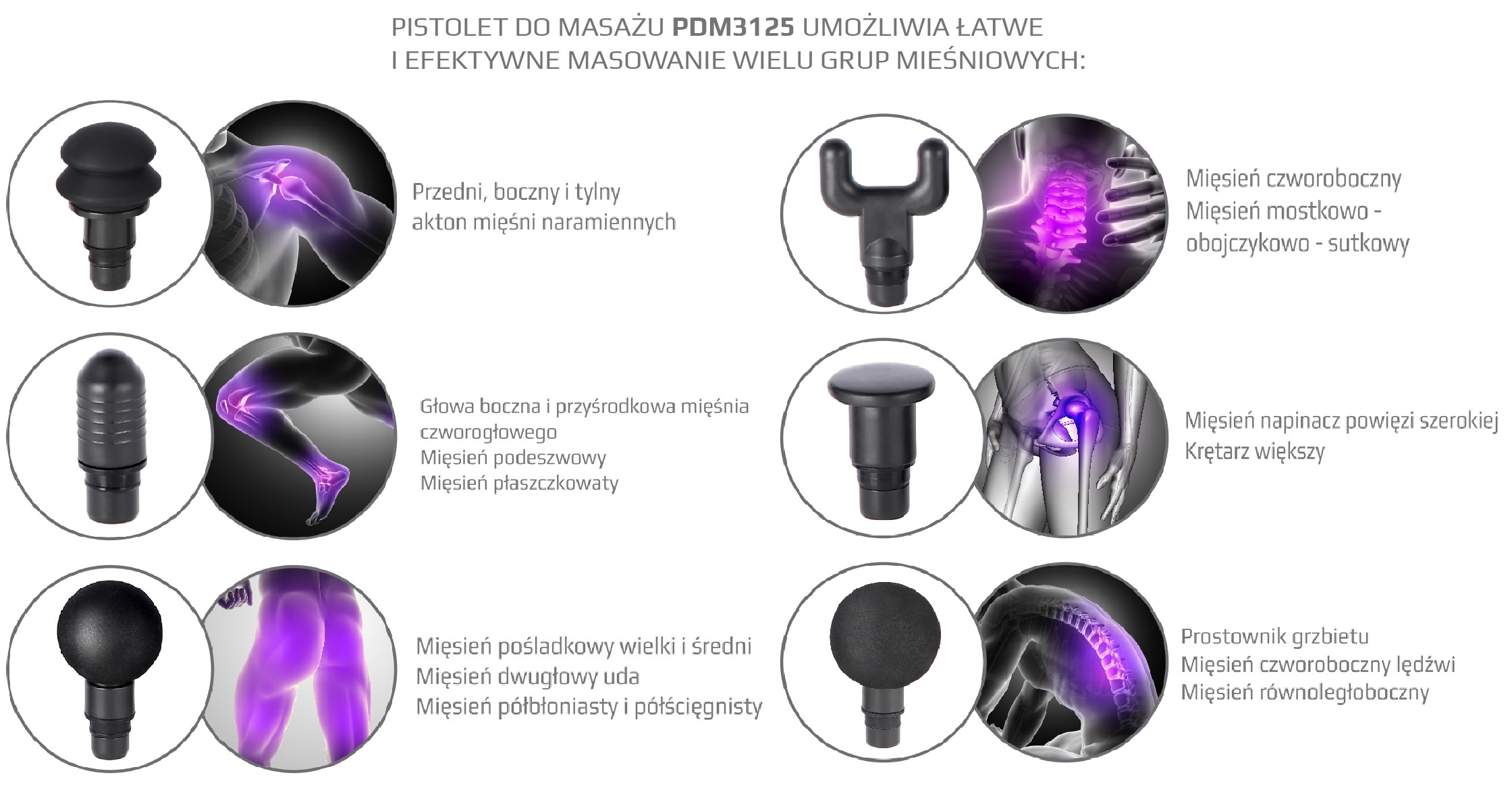 Masażer sprawdzi zarówno u sportowców, u osób z siedzącym trybem życia jak również dla fizjoterapeutów. Produkt posiada 6 wymiennych końcówek, co pozwoli dopasować masaż, do każdego rodzaju mięśnia. PDM3125H jest mocnym urządzeniem, szósty poziom prędkości, to aż 3200 ruchów na minutę. Pozwala to wykonać, naprawdę dogłębny masaż.