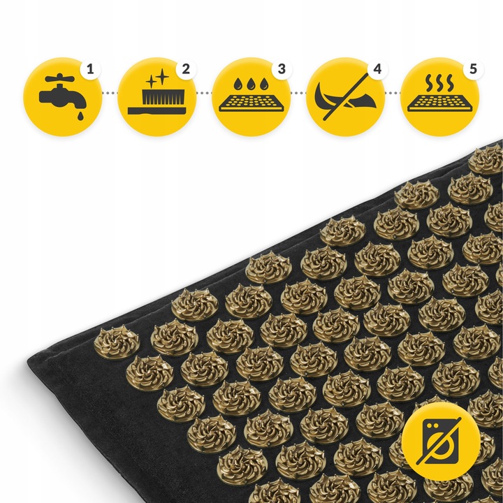 Matę do akupresury z poduszką i kolcami ECO 4FIZJO myj ręcznie letnią wodą z mydłem. Aby pozbyć się kurzu z przestrzeni między kolcami, użyj miękkiej szczoteczki. Na koniec dokładnie wypłucz pokrowiec. Pod żadnym pozorem nie trzyj i nie wyciskaj materiału. Susz tylko na płasko. Pamiętaj! Maty do akupresury nie można prać w pralce ani suszyć w suszarce. Przechowuj ją w pokrowcu zwiniętą kolcami do środka.