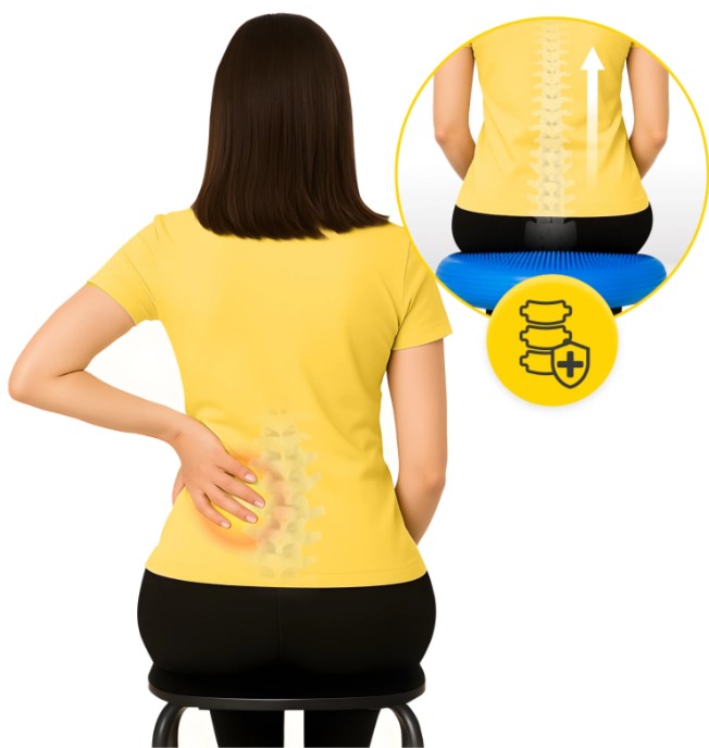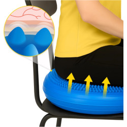 Wielogodzinne siedzenie w jednej pozycji może prowadzić do napięć mięśniowych i przeciążeń kręgosłupa. Z pomocą przychodzi niestabilna powierzchnia dużej poduszki sensomotorycznej, która aktywizuje mięśnie głębokie, pomaga korygować postawę i wspomaga zdrowe ustawienie kręgosłupa. Możesz jej używać jako nakładki na krzesło lub jako element ćwiczeń równoważnych i wzmacniających.