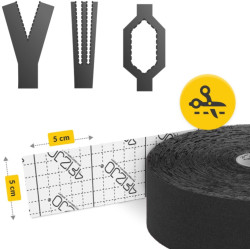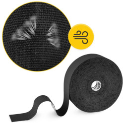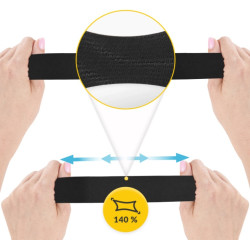 W naszym asortymencie znajduje się taśma kinezjologiczna wodoodporna o wymiarach 5 cm x 31 m. Pierwszy parametr wskazuje na szerokość tejpa, a drugi na całą długość plastra sportowego. Szerokość 5 cm to standardowy, uniwersalny rozmiar. Taką rolkę stosuje się przy popularnych sposobach oklejania (X, I, Y). Można ją pociąć na części i okleić dowolne, mniejsze części ciała.