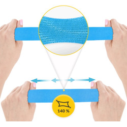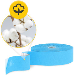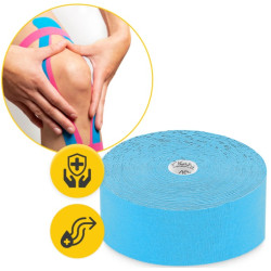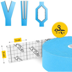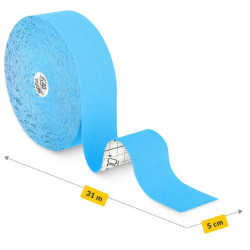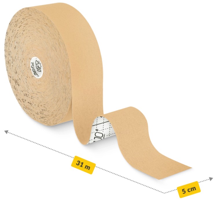 W naszym asortymencie znajduje się taśma kinezjologiczna wodoodporna o wymiarach 5 cm x 31 m. Pierwszy parametr wskazuje na szerokość tejpa, a drugi na całą długość plastra sportowego. Szerokość 5 cm to standardowy, uniwersalny rozmiar. Taką rolkę stosuje się przy popularnych sposobach oklejania (X, I, Y). Można ją pociąć na części i okleić dowolne, mniejsze części ciała.