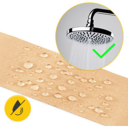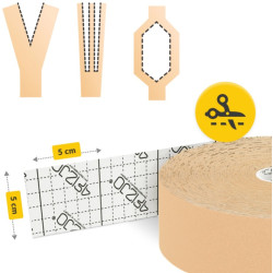 W naszym asortymencie znajduje się taśma kinezjologiczna wodoodporna o wymiarach 5 cm x 31 m. Pierwszy parametr wskazuje na szerokość tejpa, a drugi na całą długość plastra sportowego. Szerokość 5 cm to standardowy, uniwersalny rozmiar. Taką rolkę stosuje się przy popularnych sposobach oklejania (X, I, Y). Można ją pociąć na części i okleić dowolne, mniejsze części ciała.